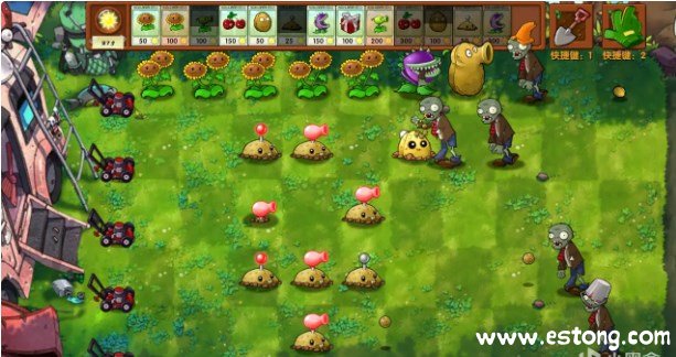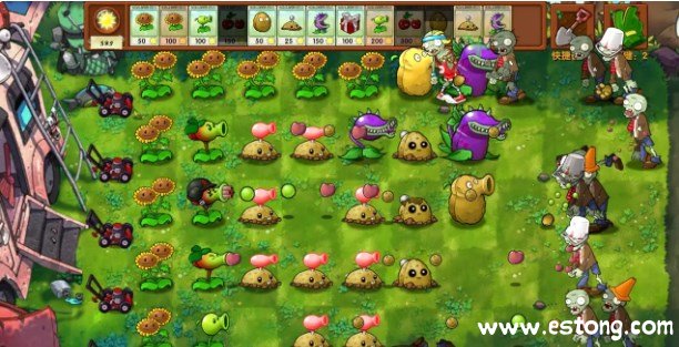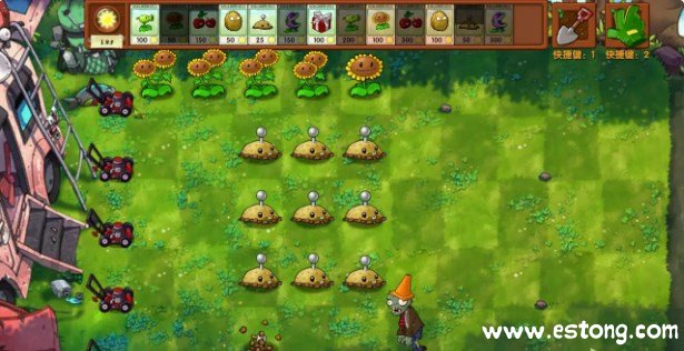2、使用高于向日葵高度的坚果保护一路,其他路可以都种上“豌豆土豆雷”和“豌豆坚果墙”。
