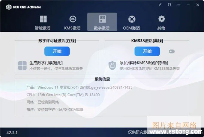 4、支持数字激活,包括数字许可证在线激活,以及kms38离线激活;